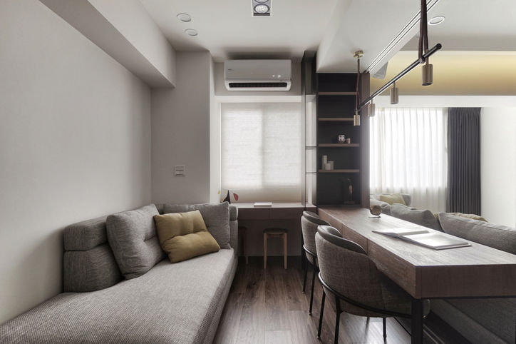 老屋重新翻修改造,在變動最少格局的條件下,將原本過於複雜的天花重新施作,拉高天花高度。地坪在石英磚地面鋪上超耐磨木地板來增加視覺溫度,立面處理以梧桐 木皮為主要元素,搭配石墨色的鐵件勾勒出的櫃體和框構增加空間中線條感,書房空間則以彈性的拉門開關方式去做變化使用。