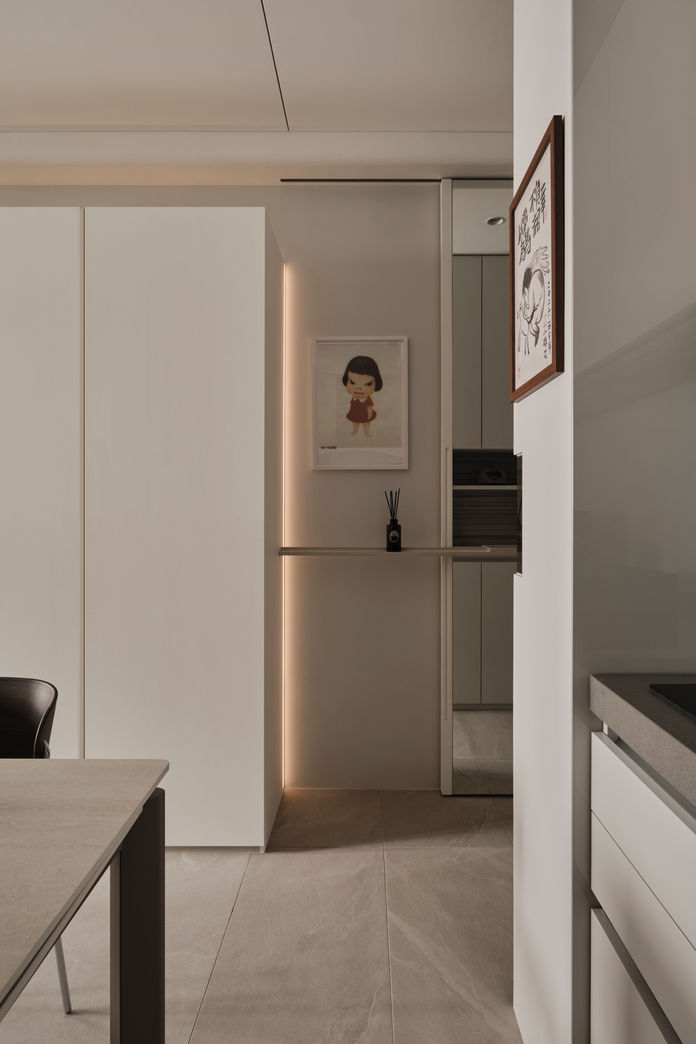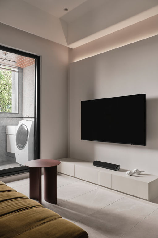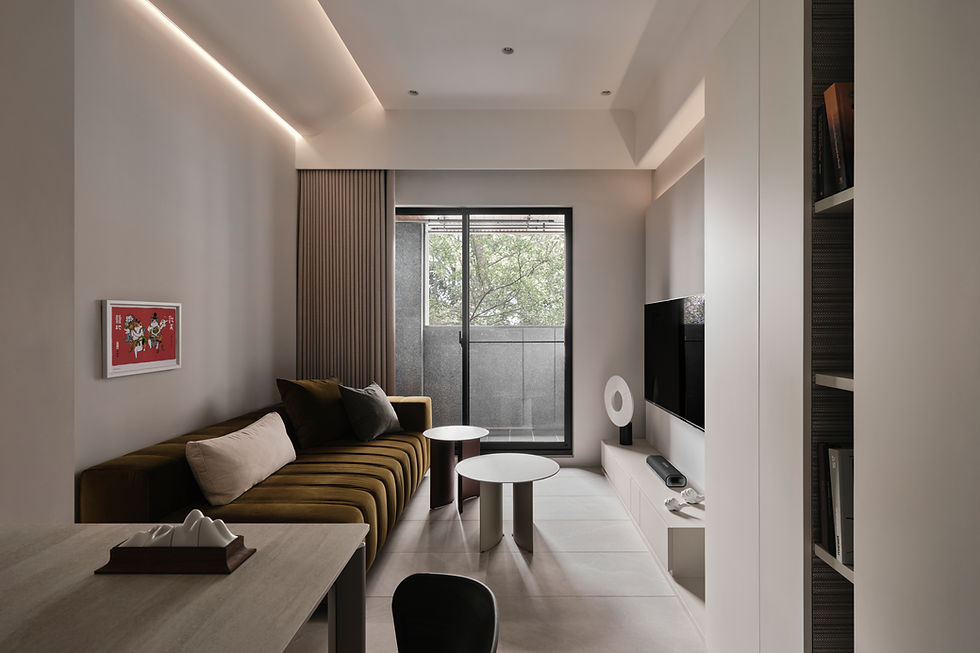 For a homeowner who has spent years abroad navigating the fast-paced gaming industry, this home in Taiwan serves as a sanctuary upon returning. We have stripped away redundant design languages, using pure white and grayscale monolithic forms to construct a sharp, "hidden order," effectively muting all visual noise. Within this cool, serene purity, a glimpse of greenery from the window blends with the olive-green sofa, standing as an oasis by the shore.
