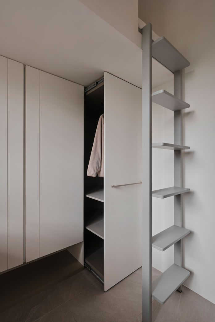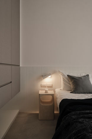 對長年旅居海外、穿梭遊戲產業的屋主而言,台灣的家是歸國後的避風港。 我們隱去繁瑣語彙,以純白與灰階塊體構築俐 落隱序,將視覺雜訊徹底靜音。 在一片冷冽純粹中,窗外透入的一抹綠意與室內的橄欖綠沙發交疊,如同停泊岸邊的綠洲。