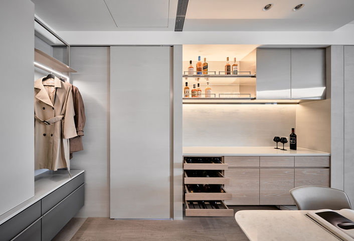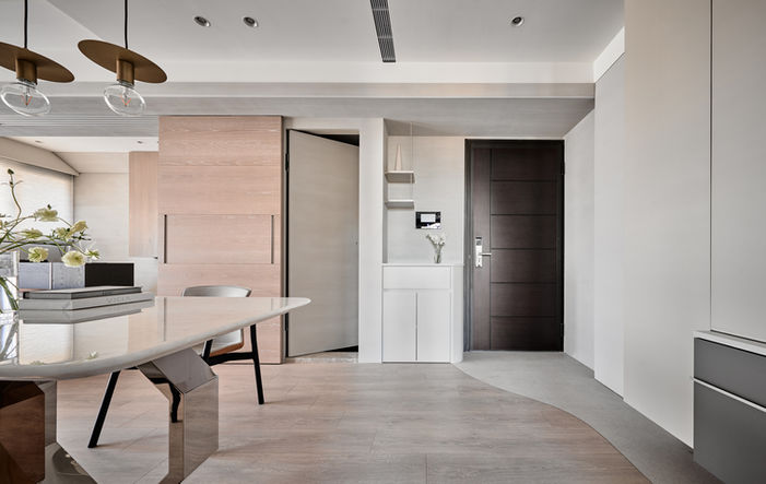 空間中我們利用兩道橫向立面去界定出區域的分布,礦物塗料包覆的橫向肌理 ,讓牆面在日光和夜晚燈光的映照下,靜靜轉換著面貌。客廳與書房間運用多重木拉門做出一個彈性的連結,能隨使用狀態轉換,各空間元素相互連結,卻也擁有獨立的功能性。